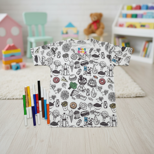 Designed for curious and active kids aged 5–6 years, this t-shirt lets them color fun illustrations of both healthy foods like fruits and veggies and tempting junk foods like burgers and fries. It’s a great way to teach healthy eating habits while encouraging creativity.